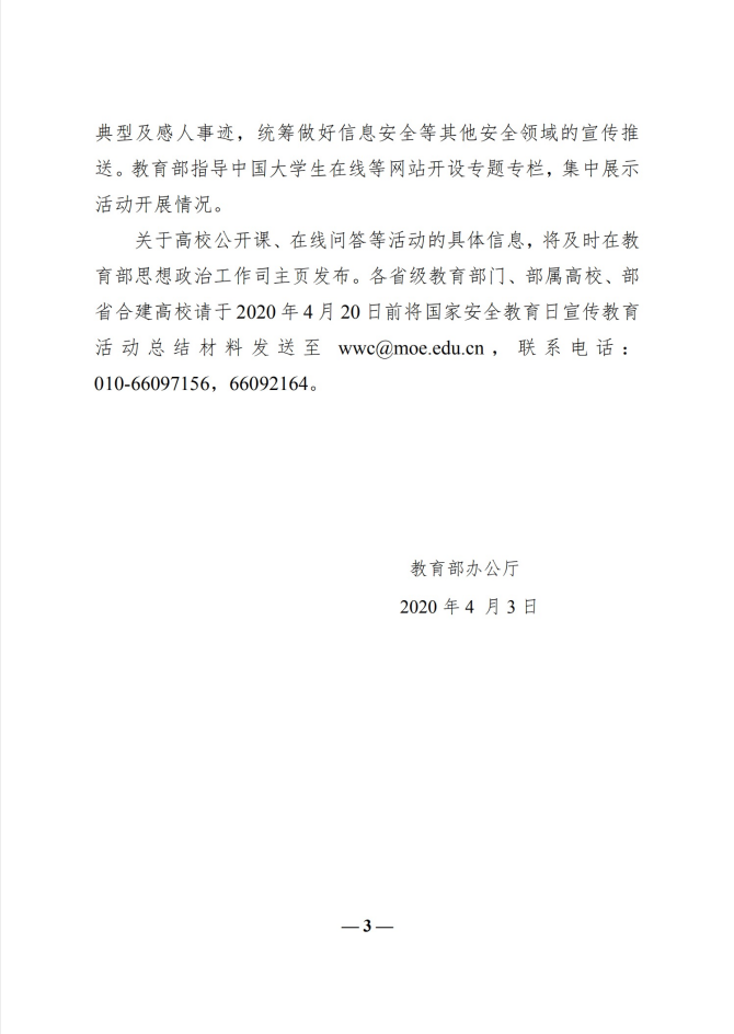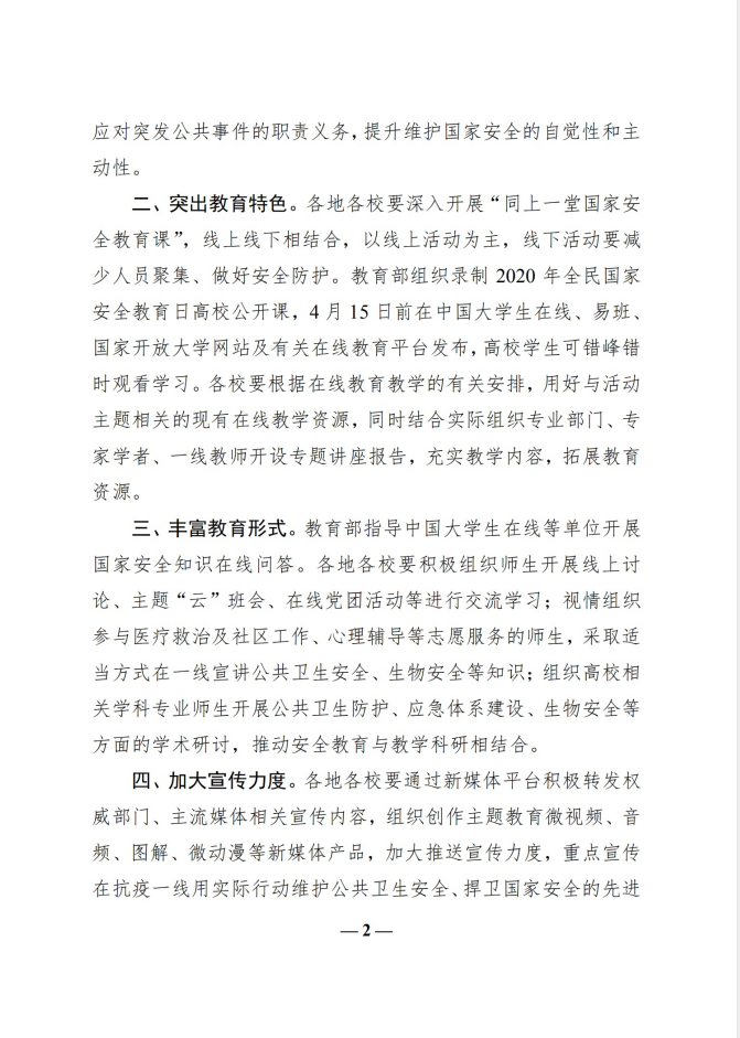 2.教育部办公厅关于组织开展2020年全民国家安全教育日宣传教育活动的通知