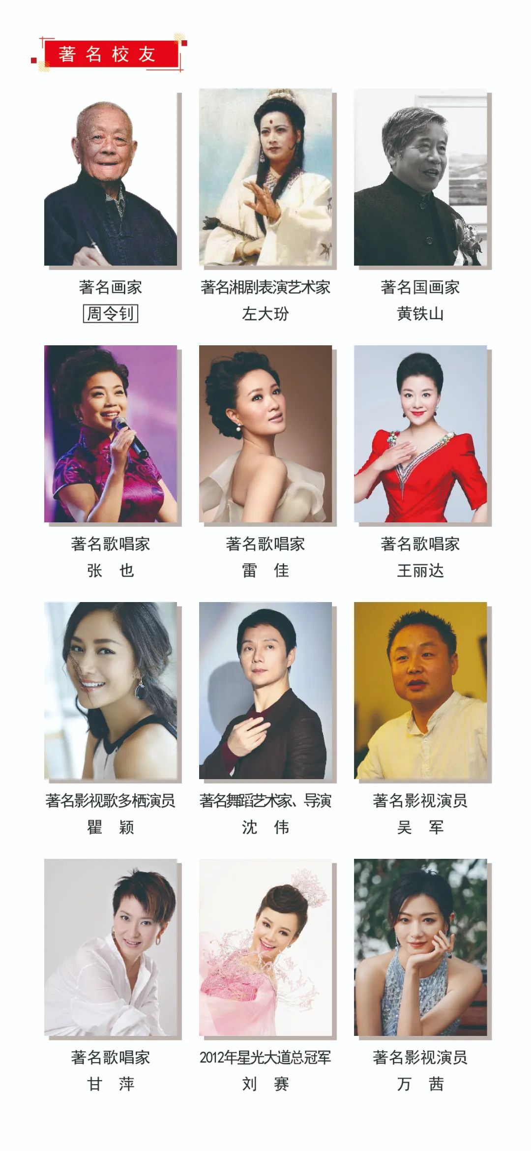 学院坚持艺术为本,始终围绕立德树人根本任务,秉持“德艺双馨,敢为人先”的校训和“围绕舞台,造就人才;立足文旅,服务社会”的办学理念,不断探索校企合作的道路,加强产、学、研融合,拓展职业教育的新理念、新视野,大力弘扬文艺“工匠精神”,积淀了深厚的人文艺术底蕴,形成了鲜明的办学特色,培养了一大批高素质、多样化的文化艺术人才。现有5万余名校友、数十位“文华奖”“梅花奖”获得者活跃在国内外文化艺术领域,创造了一个又一个艺术表演、艺术教育、艺术创作的辉煌,为湖南乃至全国文艺事业繁荣和经济社会发展做出了重要贡献。 其中,周令钊、左大玢、黄铁山、张也、雷佳、王丽达、瞿颖、沈伟、吴军、甘萍、刘赛、万茜等蜚声海内外的艺术名家,从这里走向全国、走向世界——学院因此被誉为“文艺湘军的摇篮”。