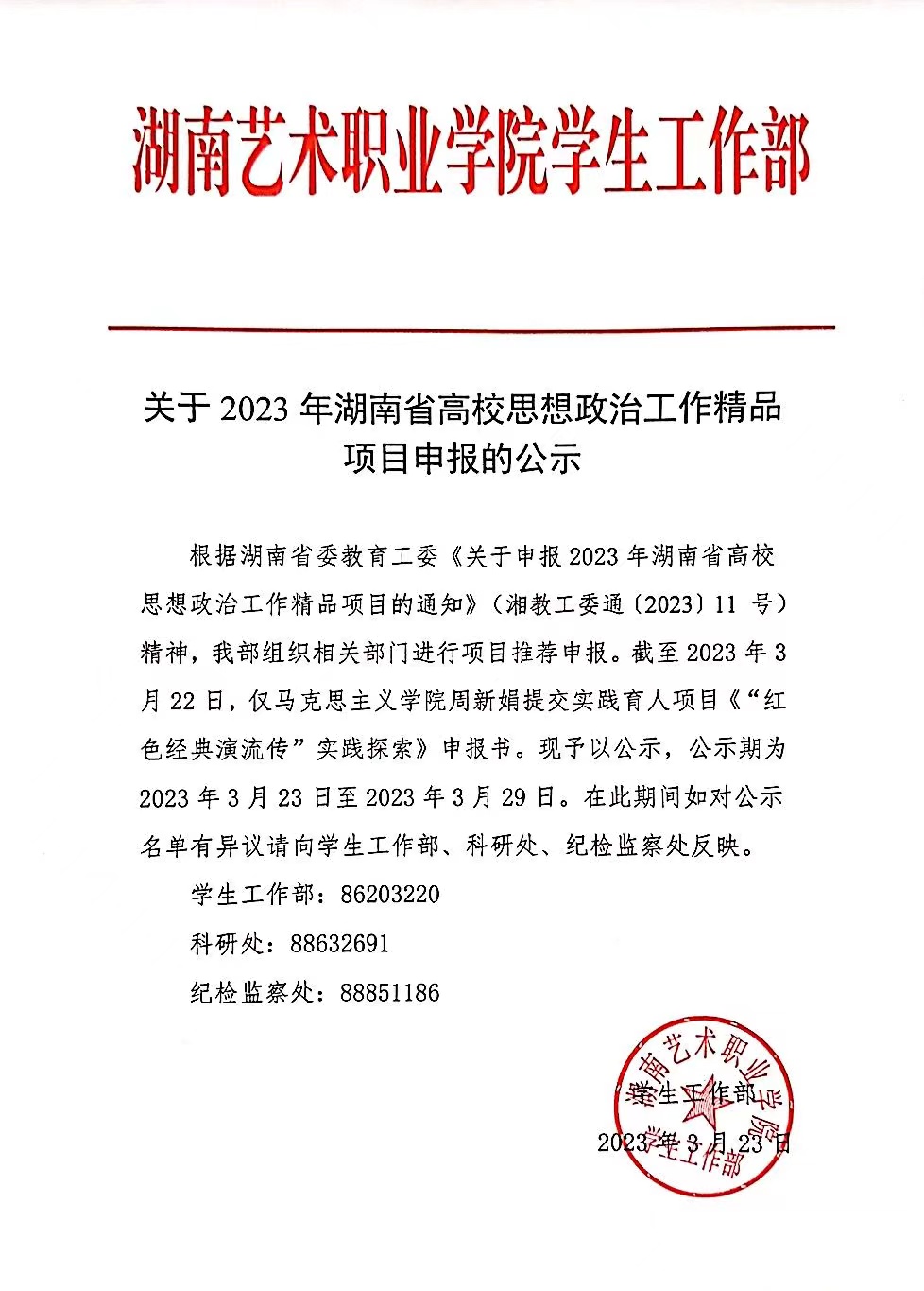 关于2023年湖南省高校思想政治工作精品项目申报的公示