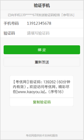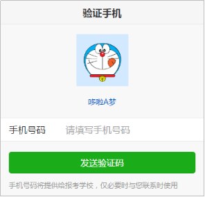 为便于联系考生,缴费前需验证考生联系电话的有效性。系统向考生手机发送随机验证码短信,考生收到验证码短信后,填写收到的验证码完成验证。