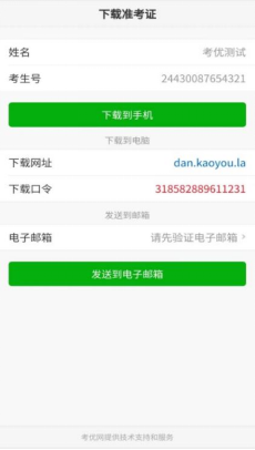 支付完成后,点击“打印准考证”按钮可以下载准考证,下载提供三种方式:下载到手机、下载到电脑、发送到电子信箱。