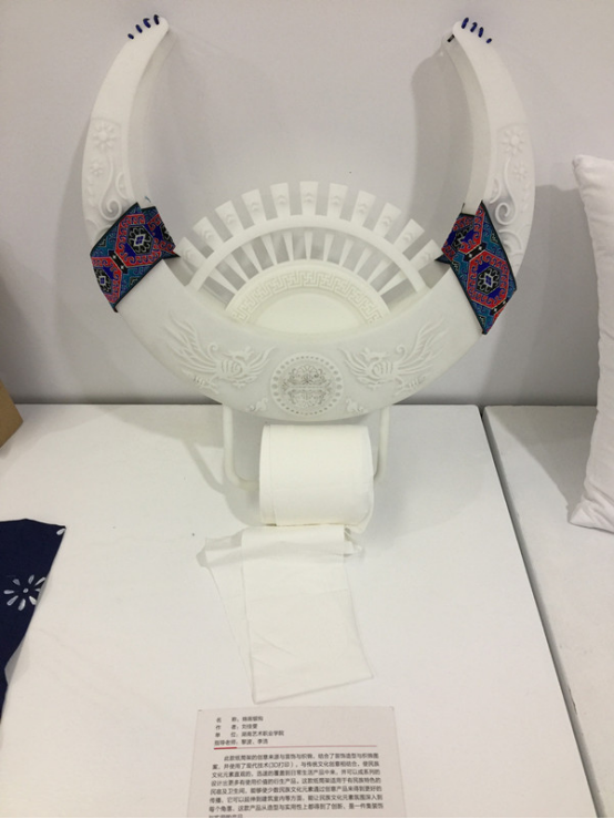 《锦画银钩》作品的创意是由苗族传统文化与“非遗”织锦相结合设计而成的纸筒架,并用现代3D打印技术将实物呈现出来。这种跨界融合设计,将少数民族图腾纹样与织锦图案立体再现,能更好的促进民族传统文化传播,有利于保护和传承优秀文化精髓,让民俗、非遗产品活起来,走进日常生活之中。该作品以跨界、融合为核心的设计理念不仅获得大赛评审专家团的赞许,而且对我院产品艺术设计专业在文创领域的创新设计及课程教学方面提供了启示。
