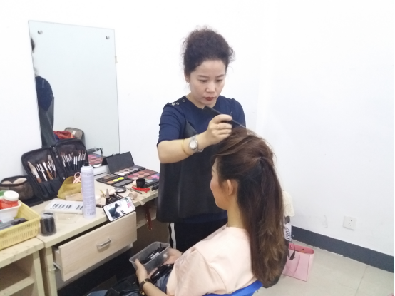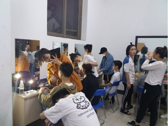 演出前化妆人员专心致志地为演员们化妆