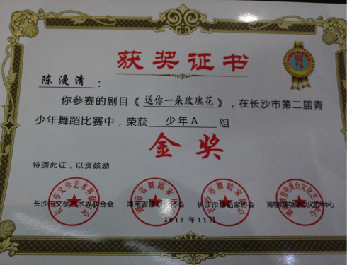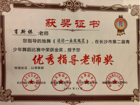 11月11日,由长沙市委宣传部、湖南省舞蹈家协会指导,长沙市文学艺术界联合会主办,长沙市舞蹈家协会、湖南教育电视台文化艺术中心承办的“庆祝改革开放四十周年”——第二届长沙市青少年舞蹈比赛颁奖晚会在湖南教育电视台演播厅隆重举行。我院舞蹈系2017级中国舞专业的陈漫清同学凭借独舞《送你一朵玫瑰花》,通过层层选拔,在900余名参赛选手中脱颖而出,荣获“少年A组”金奖第一名,指导老师肖斯祺荣获“优秀指导老师奖”。