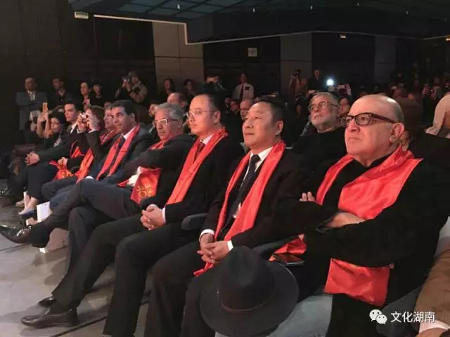突尼斯省省长阿莫尔(右四)、省文化代表海迪(右五)、突尼斯文化部国际合作司司长拉瓦尼(右六)、我驻突尼斯使馆临时代办詹晓波(右三)陪同湖南省文化厅副巡视员王鹏(右二)观看演出