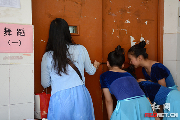 威廉官网中国官方网站党委书记王章华(左二)在舞蹈考室巡考。