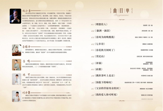 整场音乐会既有《七步诗》《春花秋月何时了》《莫尼山》《父亲的草原母亲的河》《我的爱人你可听见》等经典的“中国声音”,也有源自湖南地方戏曲的《砍樵》和《补锅》,还有反映时代主题的《挑担茶叶上北京》《海报下的咏叹》,更有《理想佳人》《偷洒一滴泪》《春风为何唤醒我》等多首西方经典曲目,周小勇在不同风格的歌曲之间切换自如。“他的演唱既有中国传统风骨,又有湖南人的精气神,更有融汇中西的艺术魅力。”现场观众激动地表示。