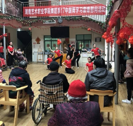 3月24日,舞蹈系17中国舞班的同学们,自发组织来到红枫康乐养老中心,为爷爷、奶奶们送上新鲜的水果,听他们讲述过去的故事,帮他们打扫卫生。期间,同学们还专门献上了一台自编自导自演的文艺演出,赢得了爷爷奶奶们的高度赞扬。在春日暖阳里,这群精灵般的孩子们的到来,让老人们更加感受到生活美好、和谐,更加感受到祖国的未来充满希望。同学们用实际行动弘扬雷锋精神,为学院创建省文明高校增光添彩。