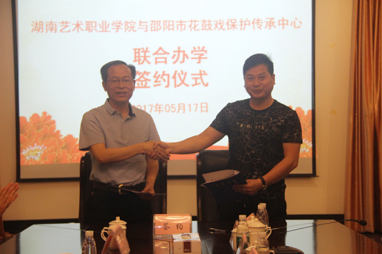 院长沈继安与邵阳市花鼓保护传承中心主任张求荣签约