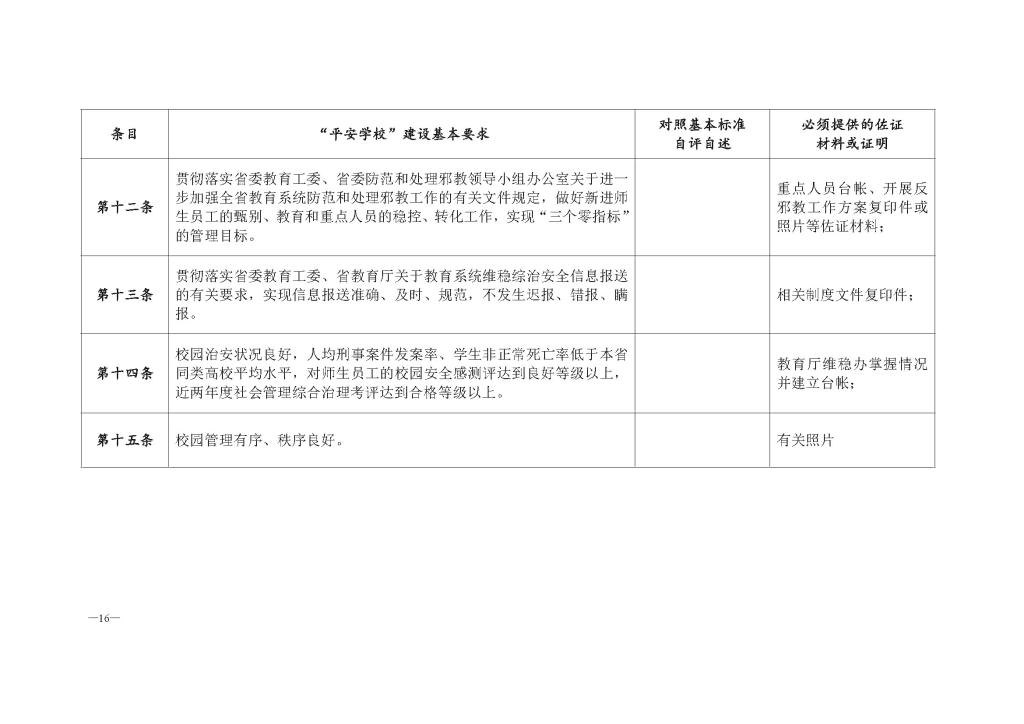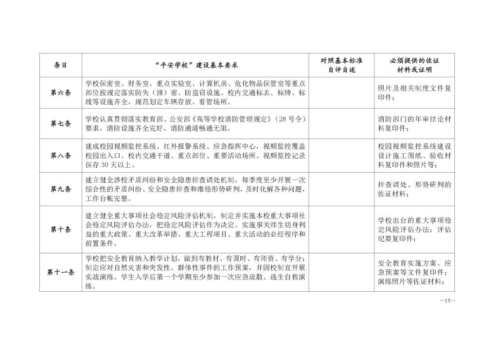 第十四条 校园治安状况良好,人均刑事案件发案率、学生非正常死亡率低于本省同类高校平均水平,对师生员工的校园安全感测评达到良好等级以上,近两年度社会管理综合治理考评达到合格等级以上。