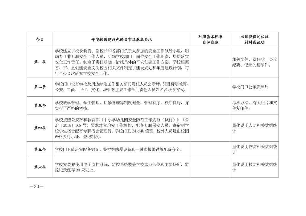 2.各地各校要以“平安学校”创建为抓手,进一步加大对学校人防、物防、技防的投入力度,全面提升校园安全防范能力和水平;要进一步建立健全校园安全隐患台账,制定隐患整改计划,落实整改责任人、整改时限;要集中组织开展校园及周边环境联合整治行动,有针对性解决一批影响学校安全环境的突出问题。